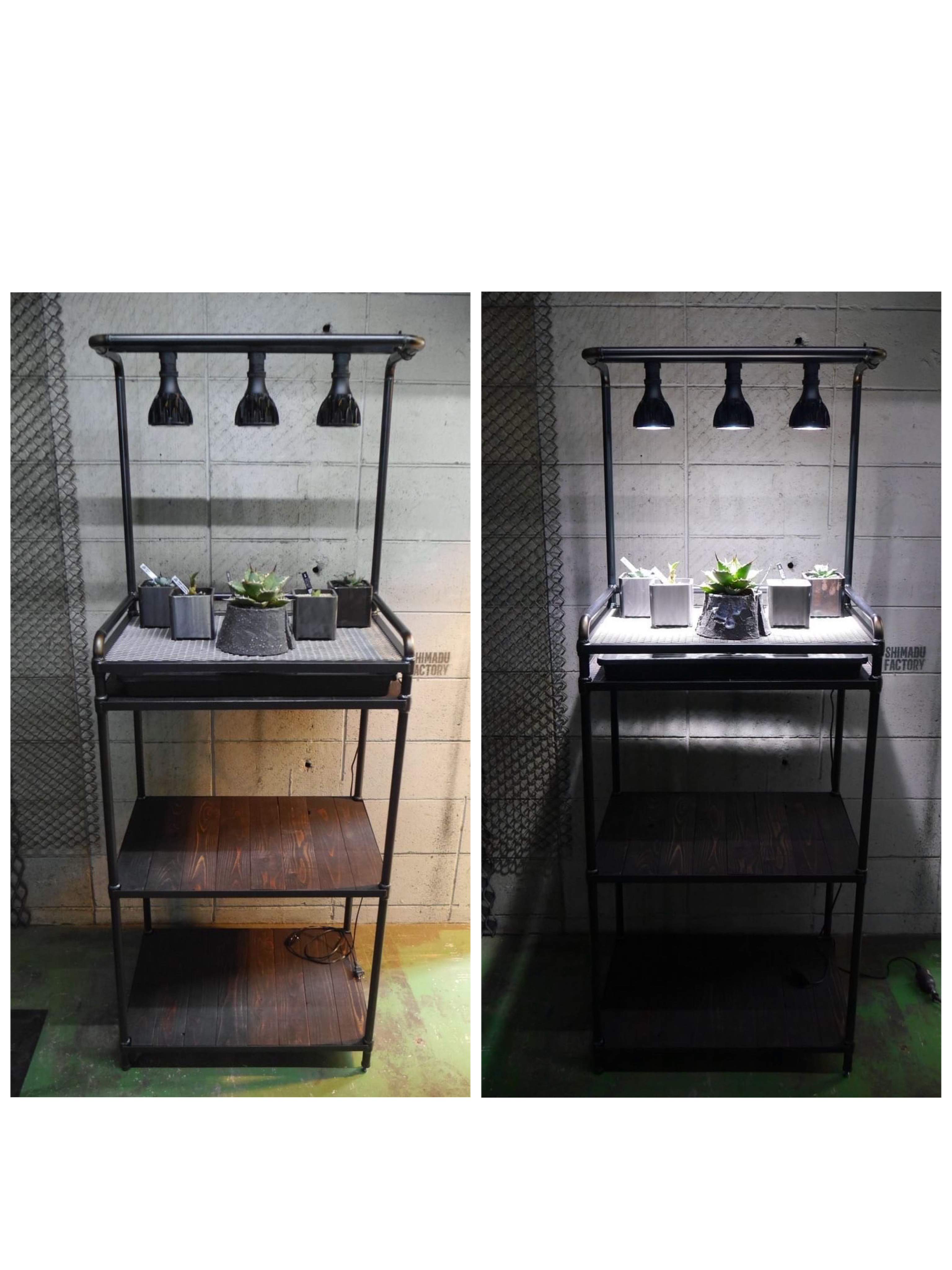 □商品説明 植物好きさんの為の植物を置く棚。 ボタニカルシェルフです。 水受けスペースやライトレールの前後移動などがこだわりのポイント* サイズオーダーも承ります! お気軽にご相談下さい◎ □サイズ W645×D450×H1720 □仕上げ 鉄 錆止めクリアー塗装 木 木材塗料エボニー(はめ板) □注意事項 ・こちらの作品は受注製作となります。納期まで1週間から2週間程かかりますこと 何卒ご理解下さいますようお願い申し上げます。 ・イメージ撮影のために使用した植物、ライト、ソケットは付いていません。ご注意下さい。ライトレールは棚と一緒に配送させていただきます。 ・作成時の微小な傷や汚れは、手作りである事をご理解頂き ご了承下さい。 ・撮影時の照明具合によって色合いに多少の違いがある場合がございます。 ご購入前によく写真をご確認ください。 ・ご購入をお考えのお客様は搬入経路をよくご確認くださいますよう お願い申し上げます。 ・返品は致しかねますのでご理解の程ご了承ください。 □価格 ¥99,000(税率10%) ¥90,000(税抜き価格) ・送料別 |